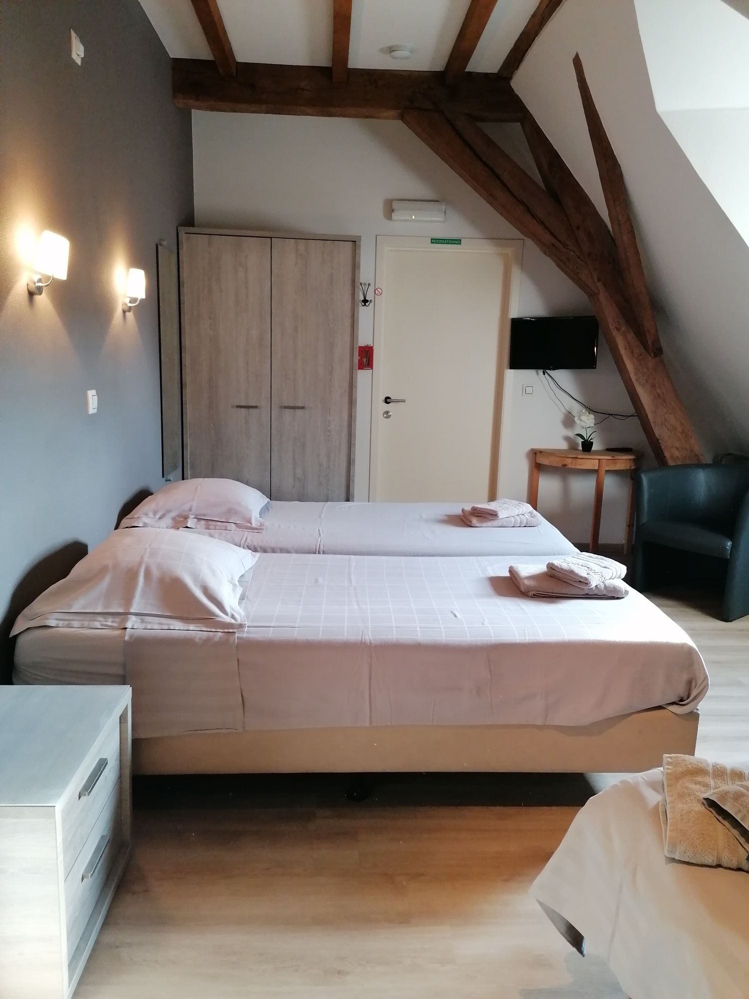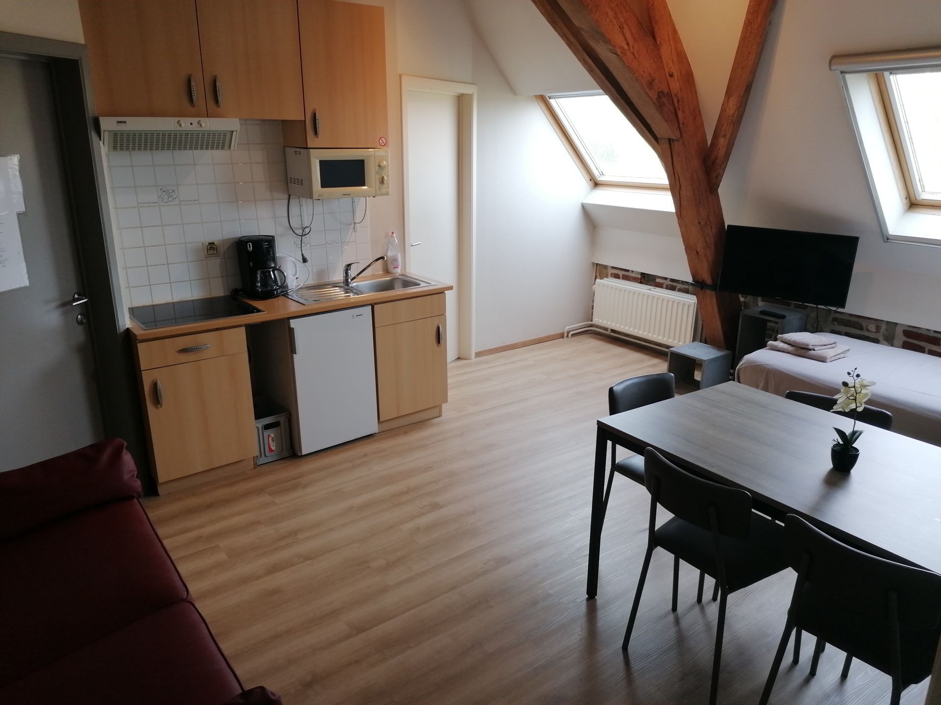 De studio heeft een living met 1 slaapplaats én een slaapkamer voor 2 personen (eventueel kan er een extra bed of kinderbedje bijgeplaatst worden) Deze bevindt zich , net als de Hoevekamer onder het eeuwenoude eiken dakgebinte met houten pinnen.